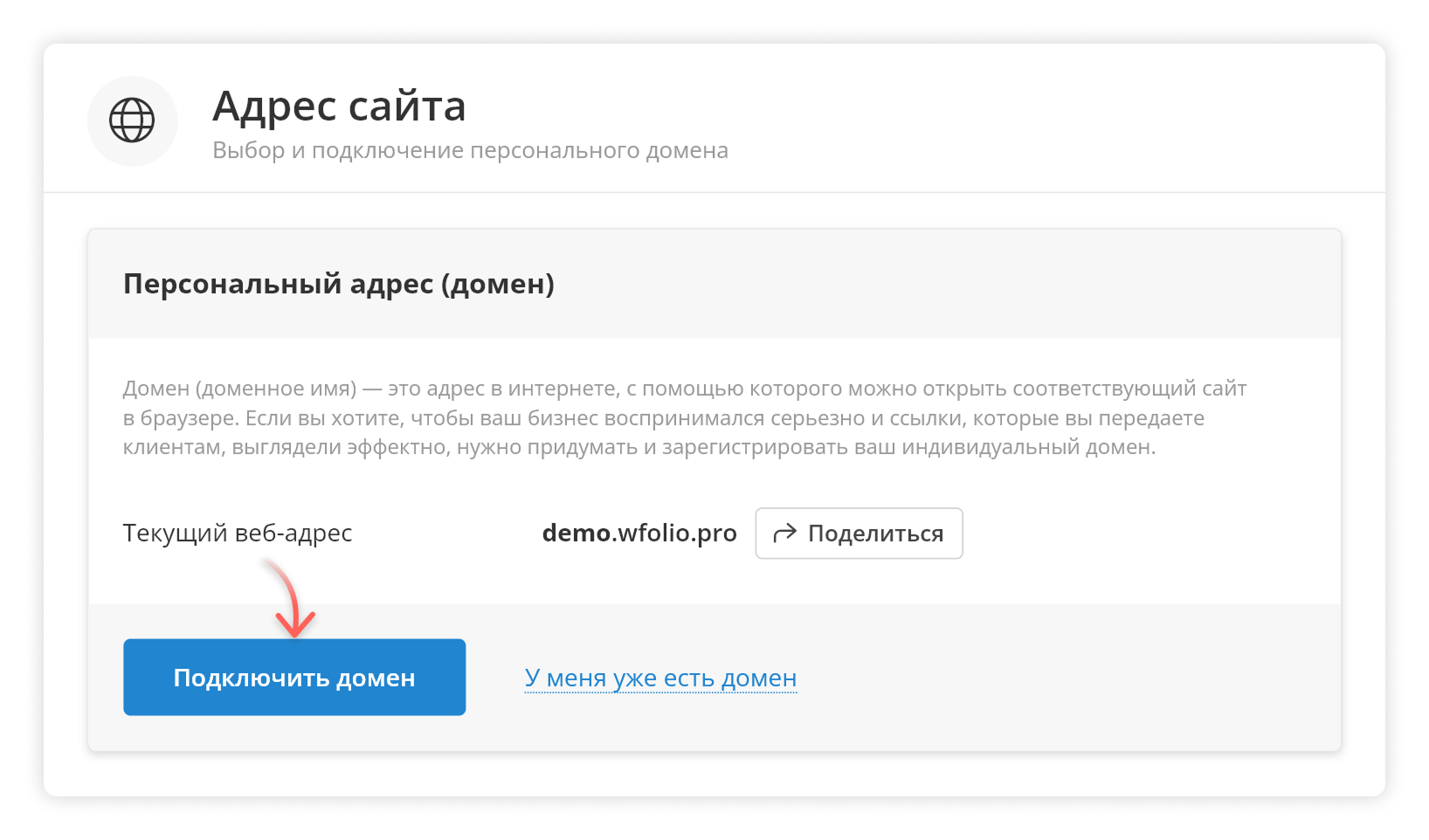 Уже покупали домен у регистратора? Смотрите инструкцию [existing-domain](https://docs.wfolio.pro/domain/existing-domain "mention").