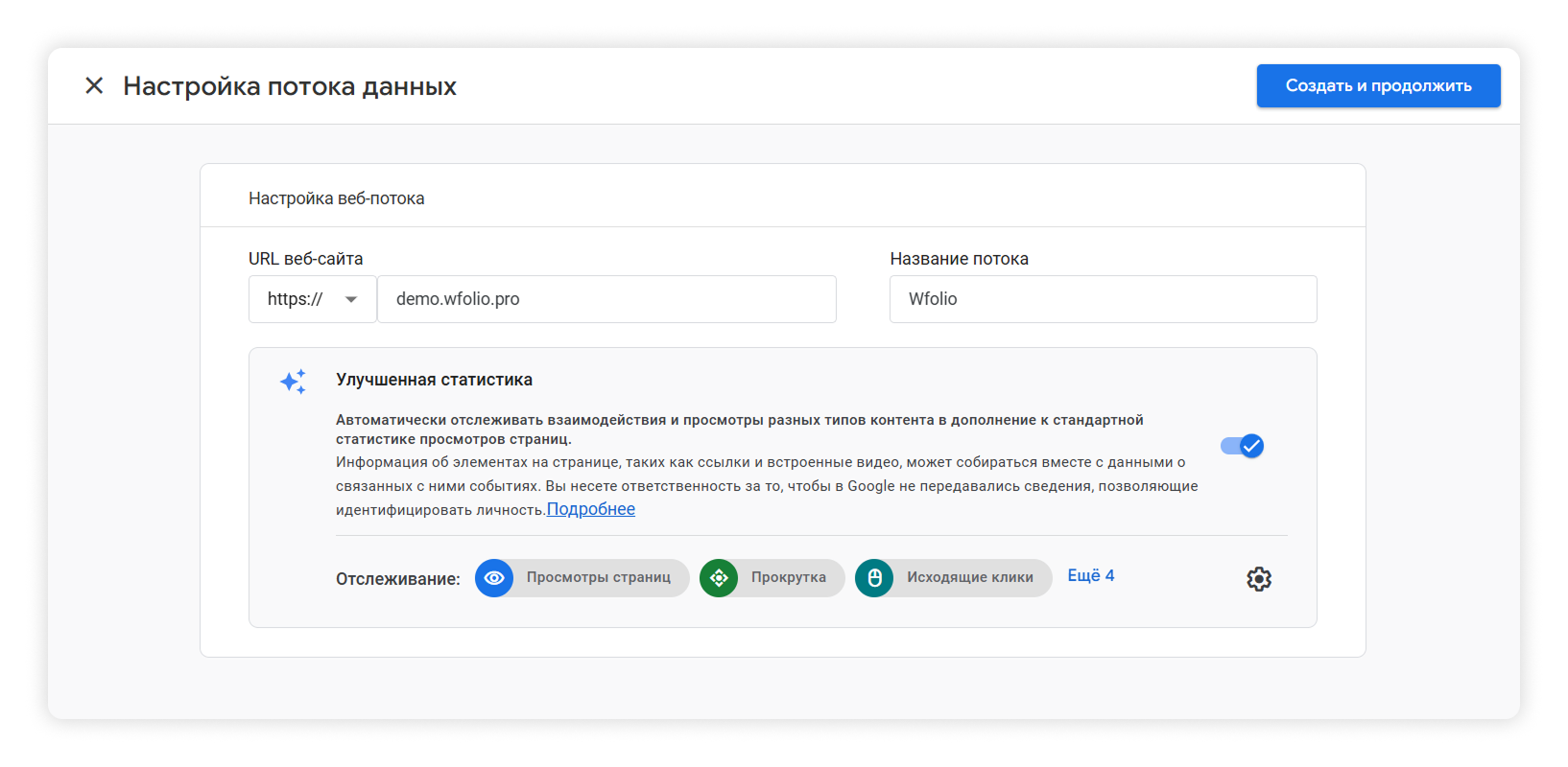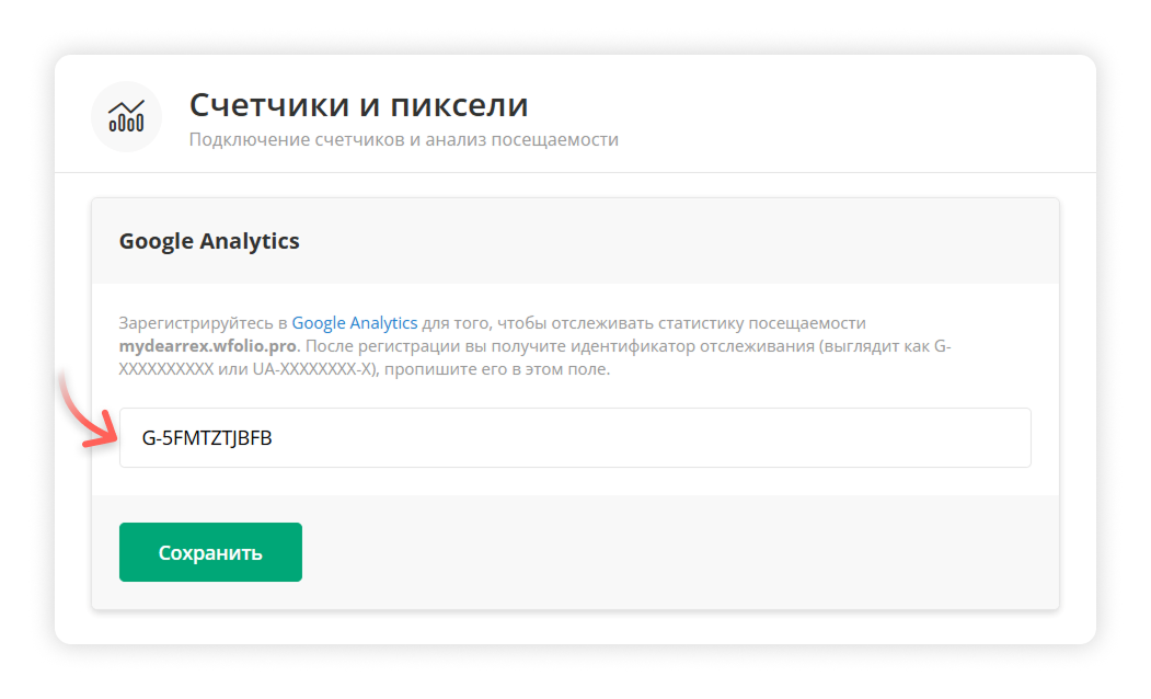 * В панели управления Wfolio перейдите в раздел настроек **«Счетчики и пиксели»**. Вставьте скопированный идентификатор потока в поле **«Google Analytics»** и сохраните изменения.