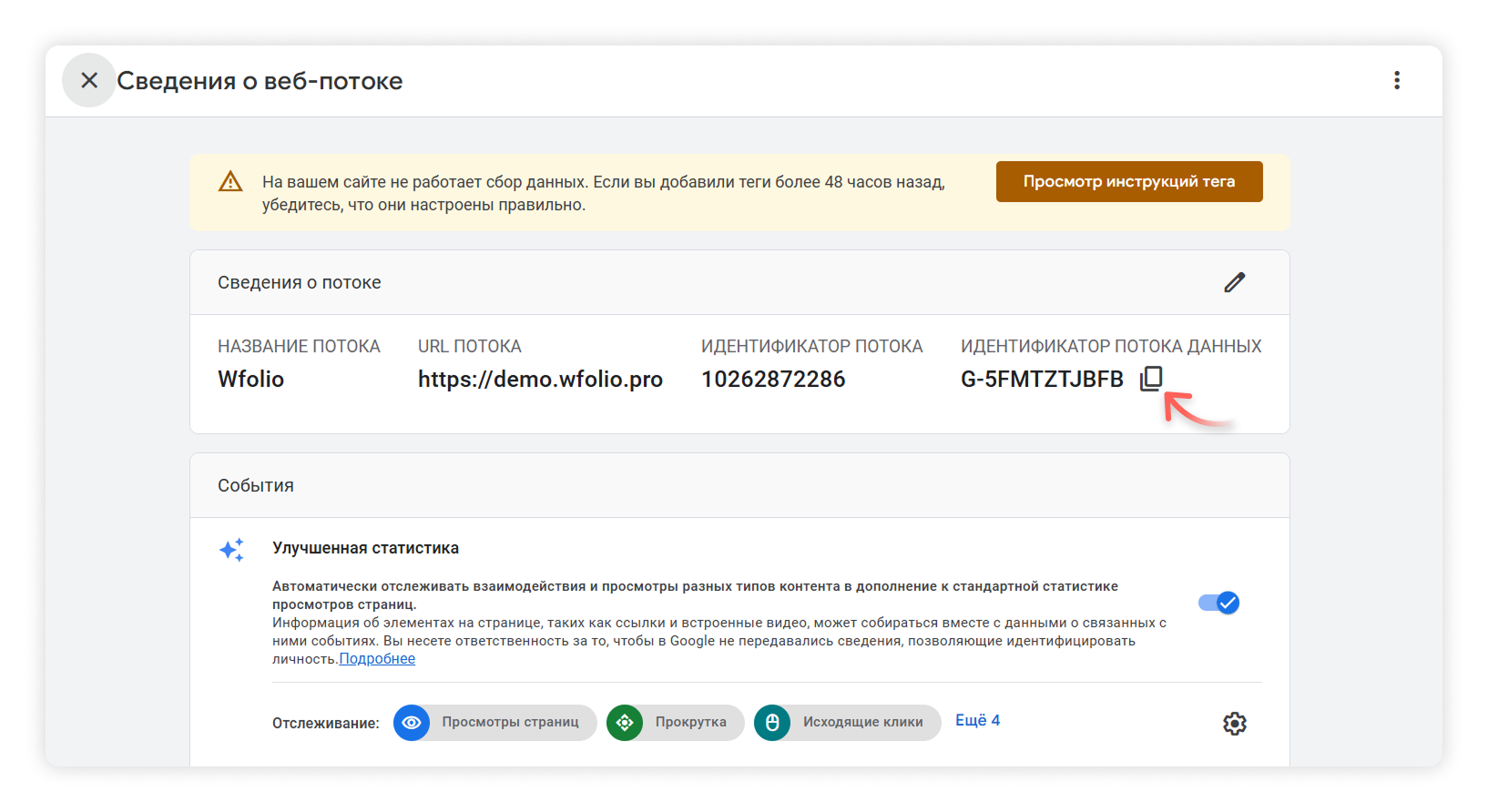 * Закройте окно с настройкой Google Tag. В следующем окне скопируйте **«Идентификатор потока данных»**.
