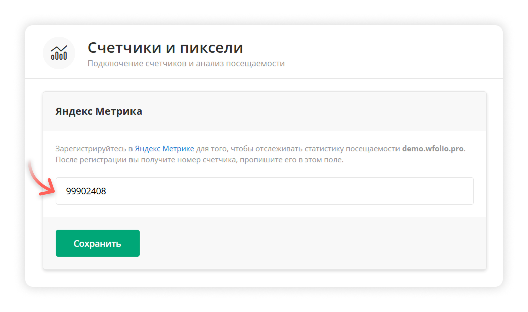 * Перейдите в настройки Wfolio в раздел **«Счетчики и пиксели»**. Вставьте скопированный номер счетчика в поле **«Яндекс Метрика»** и сохраните изменения.